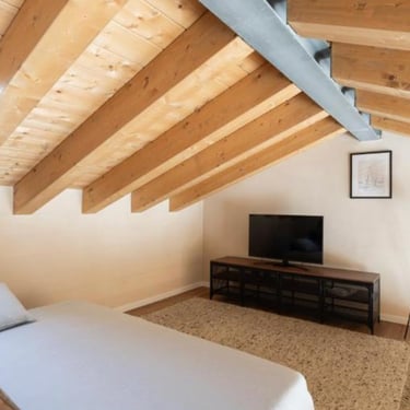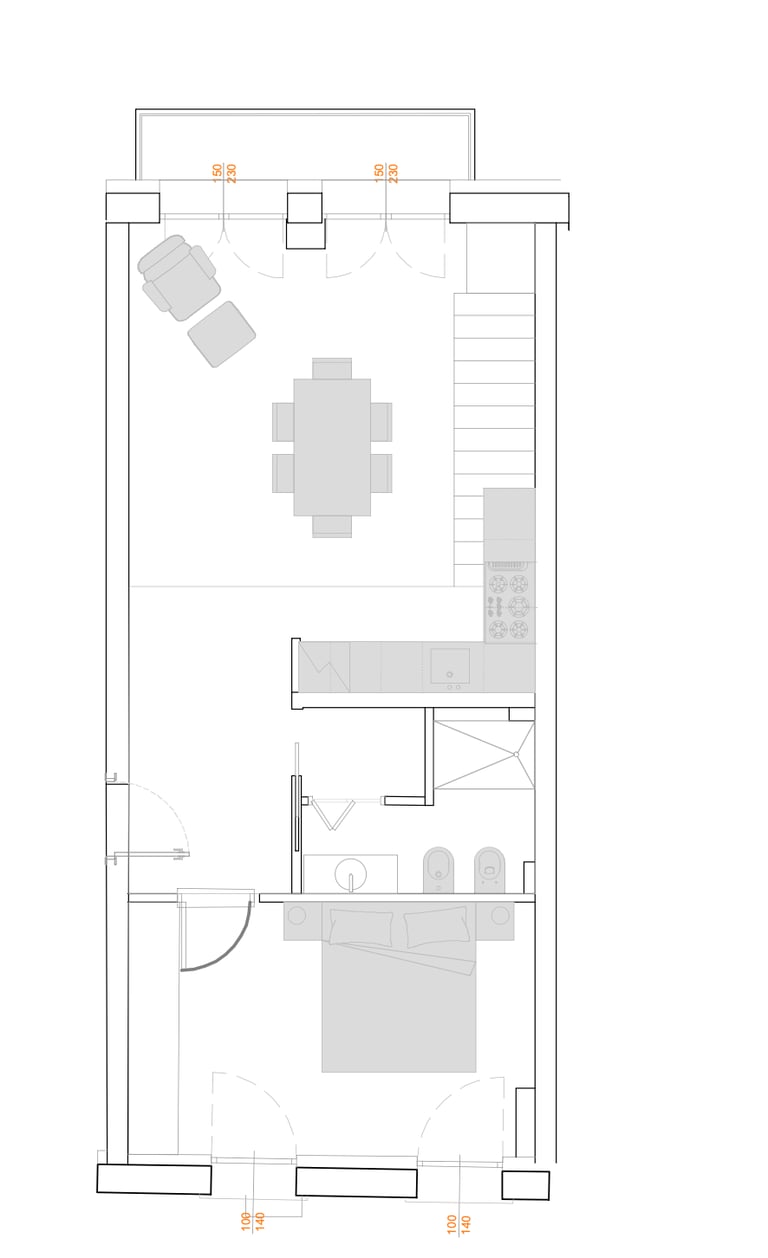 Bilocale con soppalco e bagno, vista sul giardino. Configurabile con letto matrimoniale o due singoli, più divano letto per due persone.
