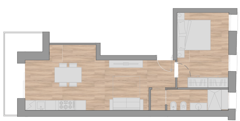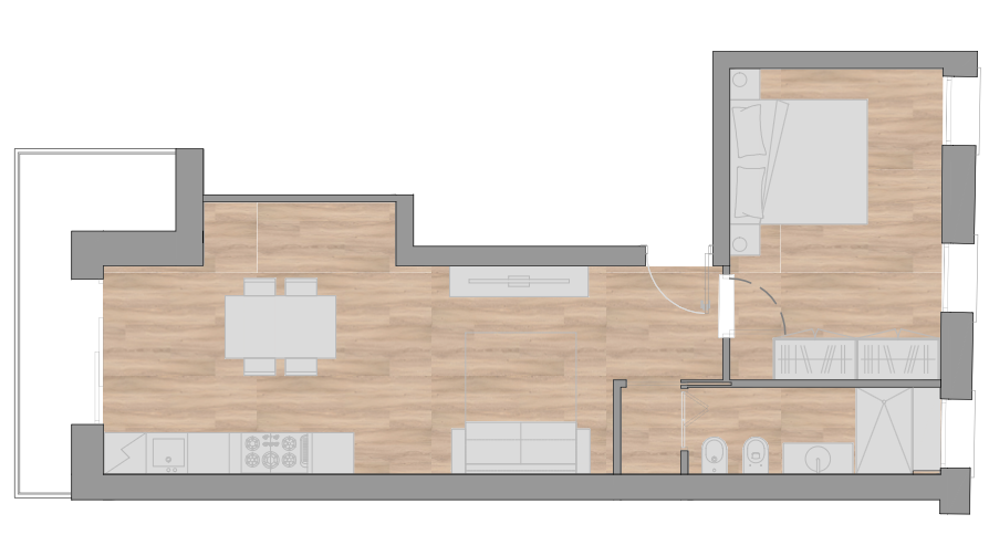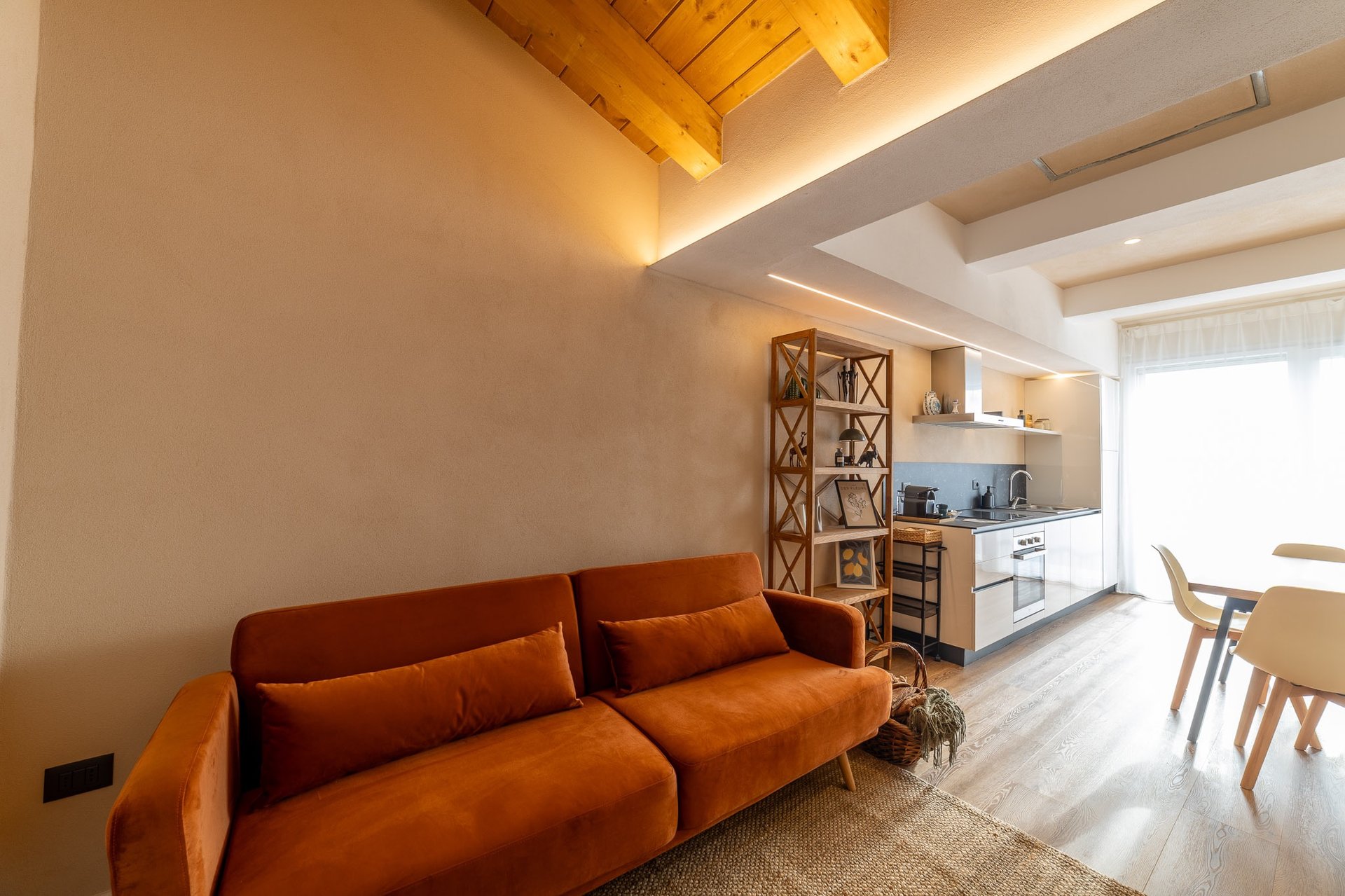 L’Interno 4 è un omaggio alla natura e alla vitalità. Qui la ristrutturazione ha giocato con il concetto di "confine sfumato": grazie al balcone e alla vista sul giardino, l’ambiente è pervaso da un'atmosfera fresca e rilassante. Lo stile Tropical, fatto di richiami organici e colori riposanti, dialoga con la nuova facciata vetrata della casa, offrendo un rifugio rigenerante che sembra quasi prolungarsi nel verde esterno.
