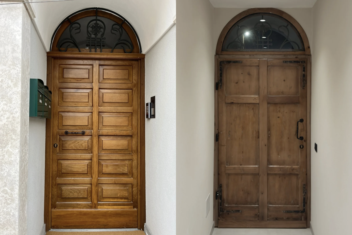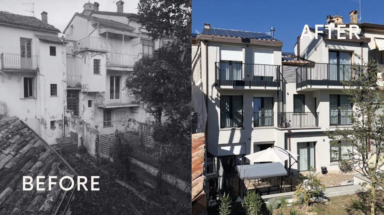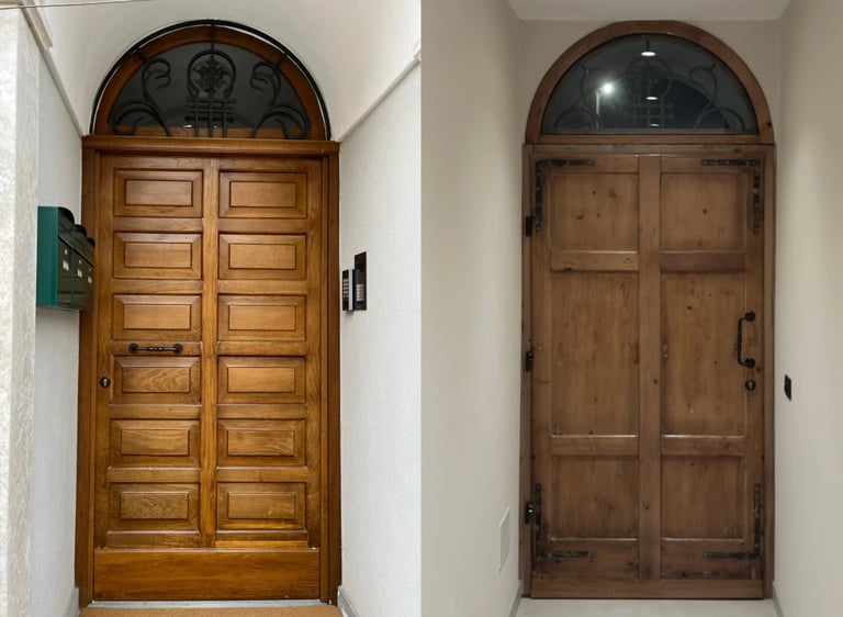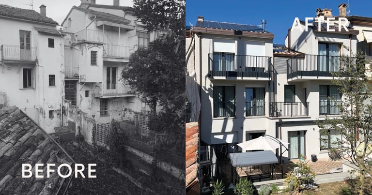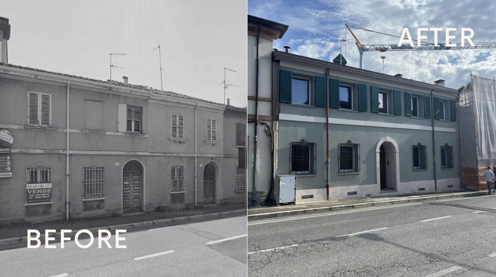 A Nord, il restauro conservativo: Abbiamo restituito vigore alla facciata storica. Il portone d'ingresso e le inferriate originali sono tornati a nuova vita, incorniciati da un nuovo basamento in pietra che dona alla casa l'importanza che merita, pur preservando la sua umiltà originaria.
